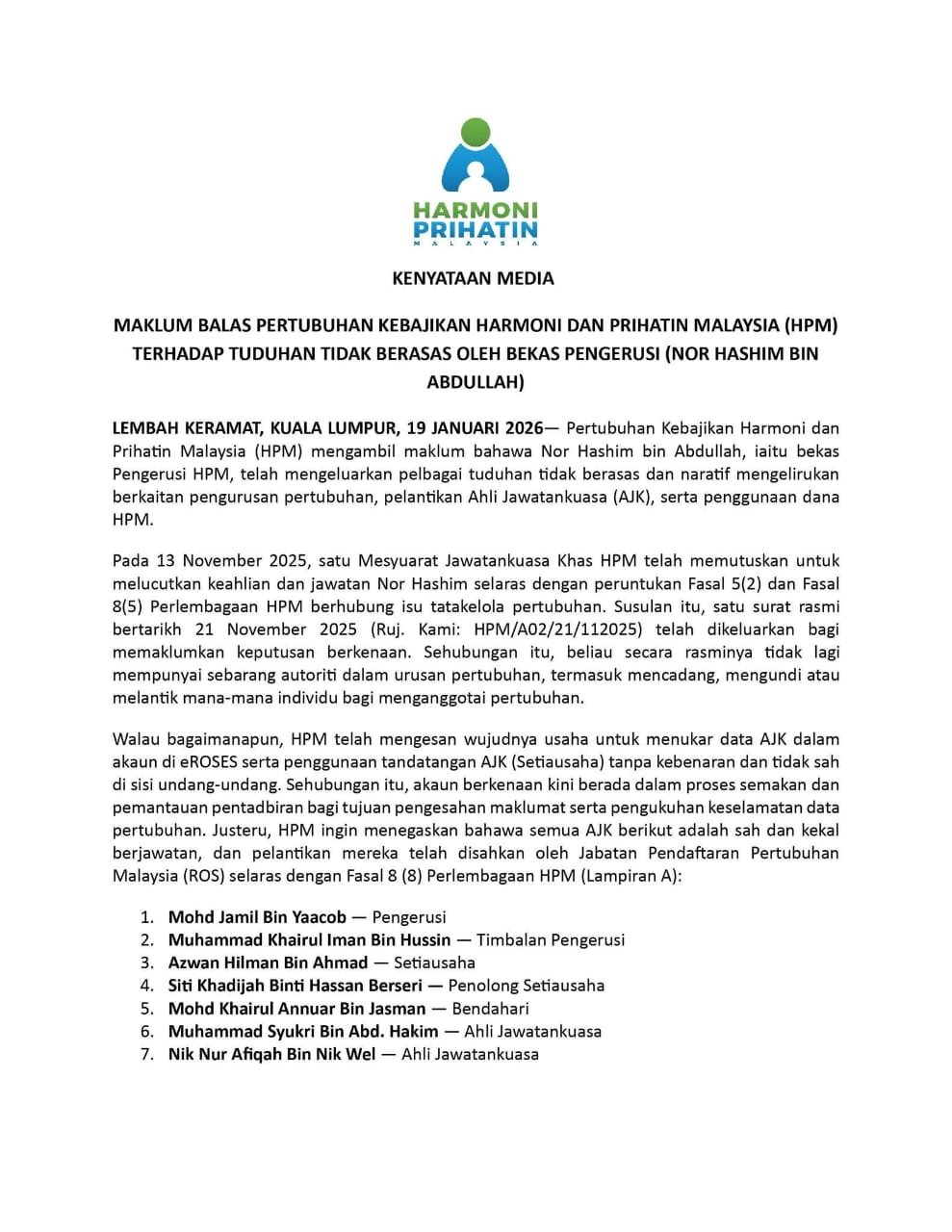 LEMBAH KERAMAT, KUALA LUMPUR, 19 JANUARI 2026 — Pertubuhan Kebajikan Harmoni dan Prihatin Malaysia (HPM) mengambil maklum bahawa Nor Hashim bin Abdullah, iaitu bekas Pengerusi HPM, telah mengeluarkan pelbagai tuduhan tidak berasas dan naratif mengelirukan berkaitan pengurusan pertubuhan, pelantikan Ahli Jawatankuasa (AJK), serta penggunaan dana HPM.