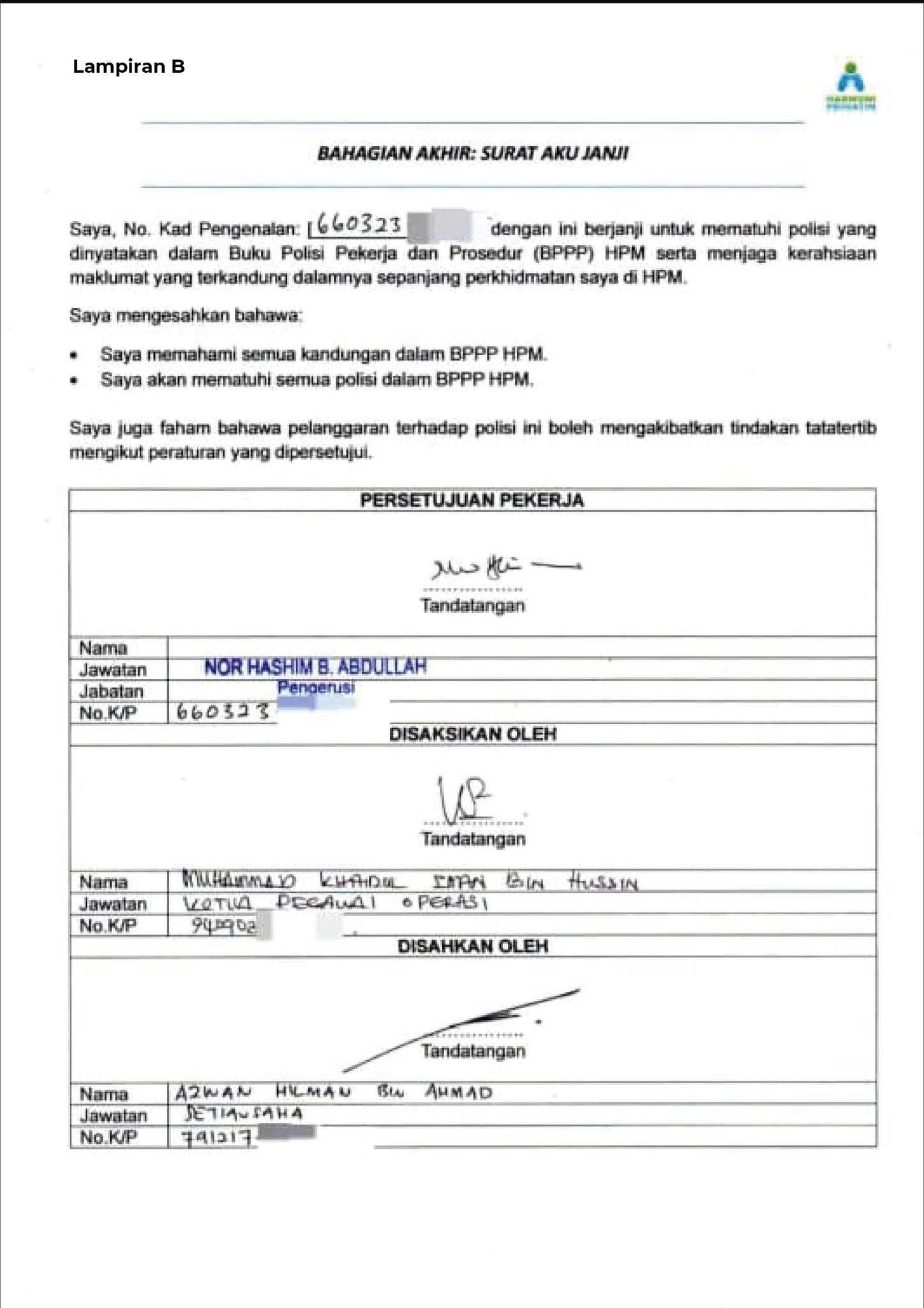 HPM juga menegaskan bahawa penggunaan dana bagi kos pengurusan, gaji, elaun, serta kebajikan kakitangan termasuk perubatan dan cermin mata adalah selaras dengan Fasal 15(5) Perlembagaan HPM dan Polisi HPM Bahagian 13 (13.1 & 13.2). Perkara ini telah dipersetujui sebulat suara serta diakui secara bertulis oleh Nor Hashim (Bekas Pengerusi) semasa beliau masih memegang jawatan melalui Surat Aku Janji (Lampiran B).